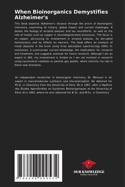 This book explores Alzheimer's disease through the prism of bioinorganic chemistry, examining its history, global impact and current challenges. It details the biology of amyloid plaques and tau neurofibrils, as well as the role of metals such as copper in neurodegenerative processes. The focus is on copper, discussing its involvement in amyloid plaques, its disrupted homeostasis and its effects on neurons. The book offers an analysis of metal deposits in the brain using X-ray absorption spectroscopy (XAS). In conclusion, it summarizes current knowledge, the implications for research and treatment, and suggests avenues for future research. Although I am an expert in XAS, my involvement is limited as I am not involved in research using synchrotron radiation or particle gas pedals, which restricts my role in these new directions.