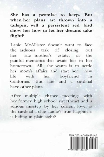 She has a promise to keep. But when her plans are thrown into a tailspin, will a persistent red bird show her how to let her dreams take flight? Lanie McAllister is ready to move on. Wrestling with her mom's death, the young woman just wants to settle the estate and soar off for good to her boyfriend in California-far away from painful memories. But she suspects the lucky cardinal she keeps seeing is trying to send a message when a flat tire puts her back in the path of the man who broke her heart. With fate constantly throwing the man her mother always hated in her way, Lanie can't seem to shake the wounds of the past. And when her current love makes a serious misstep and she discovers her ex harbors a secret, she starts to rethink what will make her truly happy. Questioning her vow to her mother to never look back, is the cardinal a clue Lanie's true happiness is hiding in plain sight? Large Print Edition