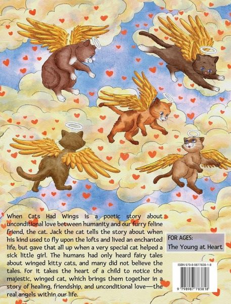When Cats Had Wings is a poetic story about the unconditional love between humanity and our furry feline friend, the cat. Jack the cat tells the story about when his kind used to fly upon the lofts and lived an enchanted life, but gave that all up when a very special cat helped a sick little girl. The humans had only heard fairy tales about winged kitty cats, and many did not believe the tales. For it takes the heart of a child to notice the majestic, winged cat, which brings them together in a story of healing, friendship, and unconditional love-the real angels within our life. For all ages, especially for The Young at Heart!
