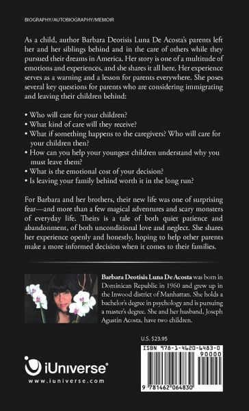 As a child, author Barbara Deotisis Luna De Acosta's parents left her and her siblings behind and in the care of others while they pursued their dreams in America. Her story is one of a multitude of emotions and experiences, and she shares it all here. Her experience serves as a warning and a lesson for parents everywhere. She poses several key questions for parents who are considering immigrating and leaving their children behind: ¿ Who will care for your children? ¿ What kind of care will they receive? ¿ What if something happens to the caregivers? Who will care for your children then? ¿ How can you help your youngest children understand why you must leave them? ¿ What is the emotional cost of your decision? ¿ Is leaving your family behind worth it in the long run? For Barbara and her brothers, their new life was one of surprising fear-and more than a few magical adventures and scary monsters of everyday life. Theirs is a tale of both quiet patience and abandonment, of both unconditional love and neglect. She shares her experience openly and honestly, hoping to help other parents make a more informed decision when it comes to their families.