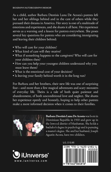 As a child, author Barbara Deotisis Luna De Acosta's parents left her and her siblings behind and in the care of others while they pursued their dreams in America. Her story is one of a multitude of emotions and experiences, and she shares it all here. Her experience serves as a warning and a lesson for parents everywhere. She poses several key questions for parents who are considering immigrating and leaving their children behind: ¿ Who will care for your children? ¿ What kind of care will they receive? ¿ What if something happens to the caregivers? Who will care for your children then? ¿ How can you help your youngest children understand why you must leave them? ¿ What is the emotional cost of your decision? ¿ Is leaving your family behind worth it in the long run? For Barbara and her brothers, their new life was one of surprising fear-and more than a few magical adventures and scary monsters of everyday life. Theirs is a tale of both quiet patience and abandonment, of both unconditional love and neglect. She shares her experience openly and honestly, hoping to help other parents make a more informed decision when it comes to their families.