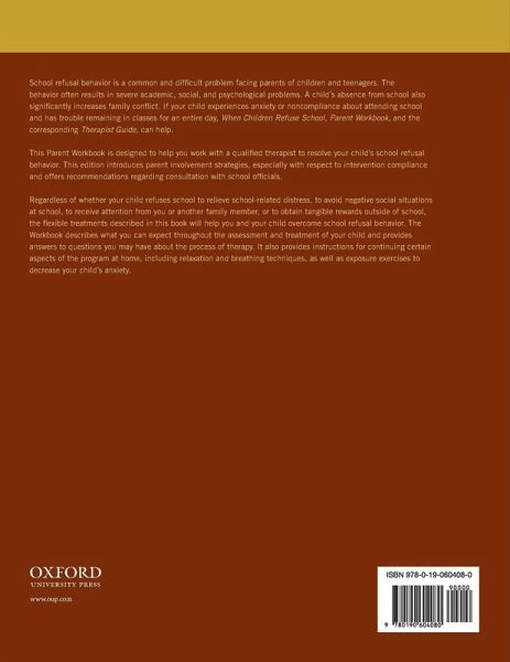 School refusal behavior is a common and difficult problem facing parents of children and teenagers. The behavior often results in severe academic, social, and psychological problems. A child's absence from school also significantly increases family conflict. If your child experiences anxiety or noncompliance about attending school and has trouble remaining in classes for an entire day, When Children Refuse School, Parent Workbook, and the corresponding Therapist Guide, can help. The third edition of When Children Refuse School, Parent Workbook, is designed to help you work with a qualified therapist to resolve your child's school refusal behavior. This edition introduces parent involvement strategies, especially with respect to intervention compliance, and offers recommendations regarding consultation with school officials. Regardless of whether your child refuses school to relieve school-related distress, to avoid negative social situations at school, to receive attention from you or another family member, or to obtain tangible rewards outside of school, the flexible treatments described in this book will help you and your child overcome school refusal behavior. The Workbook describes what you can expect throughout the assessment and treatment of your child and provides answers to questions you may have about the process of therapy. It also provides instructions for continuing certain aspects of the program at home, including relaxation and breathing techniques, as well as exposure exercises to decrease your child's anxiety.