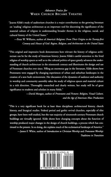 For nearly eighteen centuries, two fundamental spatial plans dominated Christian architecture: the basilica and the central plan. In the 1880s, however, profound socio-economic and technological changes in the United States contributed to the rejection of these traditions and the development of a radically new worship building, the auditorium church. When Church Became Theatre focuses on this radical shift in evangelical Protestant architecture and links it to changes in worship style and religious mission. The auditorium style, featuring a prominent stage from which rows of pews radiated up a sloping floor, was derived directly from the theatre, an unusual source for religious architecture but one with a similar goal-to gather large groups within range of a speaker's voice. Theatrical elements were prominent; many featured proscenium arches, marquee lighting, theatre seats, and even opera boxes. Examining these churches and the discussions surrounding their development, Jeanne Halgren Kilde focuses on how these buildings helped congregations negotiate supernatural, social, and personal power. These worship spaces underscored performative and entertainment aspects of the service and in so doing transformed relationships between clergy and audiences. In auditorium churches, the congregants' personal and social power derived as much from consumerism as from piety, and clerical power lay in dramatic expertise rather than connections to social institutions. By erecting these buildings, argues Kilde, middle class religious audiences demonstrated the move toward a consumer-oriented model of religious participation that gave them unprecedented influence over the worshipexperience and church mission.