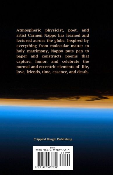 Atmospheric physicist, poet, and artist Carmen Nappo has learned and lectured across the globe. Inspired by everything from molecular matter to holy matrimony, Nappo puts pen to paper and constructs poems that capture, honor, and celebrate the normal and eccentric elements of life, love, friends, time, essence, and death.