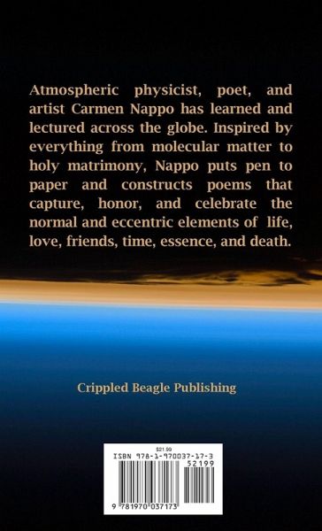 Atmospheric physicist, poet, and artist Carmen Nappo has learned and lectured across the globe. Inspired by everything from molecular matter to holy matrimony, Nappo puts pen to paper and constructs poems that capture, honor, and celebrate the normal and eccentric elements of life, love, friends, time, essence, and death.