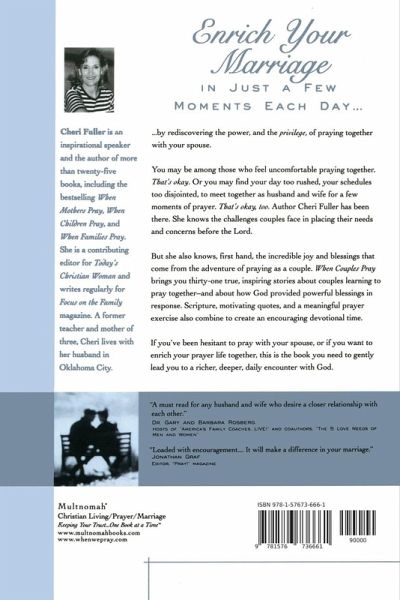 More than a book about praying together, this collection of dynamic resources motivates and guides couples into meaningful prayer! Statistics show that when couples pray together divorce rates plummet to less than 1 percent. Outspoken "prayer warrior" Cheri Fuller takes aim at interference to couples praying together by providing accessible tools to unite them before God. Each chapter offers a brief vignette about real people, a Scripture verse, a prayer exercise, and a "parting thought" for couples to ignite them in prayer. Fuller promises a "double blessing" to readers who pray this way -- the joy of experiencing answered prayer and the fulfillment of deepening marital intimacy.