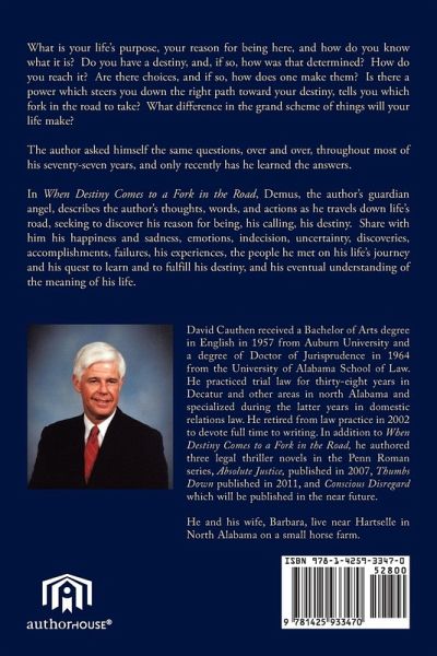 What is your life's purpose, your reason for being here, and how do you know what it is? Do you have a destiny, and, if so, how was that determined? How do you reach it? Are there choices, and if so, how does one make them? Is there a power which steers you down the right path toward your destiny, tells you which fork in the road to take? What difference in the grand scheme of things will your life make? The author asked himself the same questions, over and over, throughout most of his seventy-seven years, and only recently has he learned the answers. In When Destiny Comes to a Fork in the Road, Demus, the author's guardian angel, describes the author's thoughts, words, and actions as he travels down life's road, seeking to discover his reason for being, his calling, his destiny. Share with him his happiness and sadness, emotions, indecision, uncertainty, discoveries, accomplishments, failures, his experiences, the people he met on his life's journey and his quest to learn and to fulfill his destiny, and his eventual understanding of the meaning of his life.