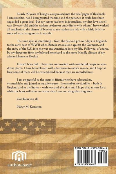 Nearly 90 years of living is compressed into the brief pages of this book. I am sure that, had I been granted the time and the patience, it could have been expanded a great deal. But my career has been in journalism, my first love since I was 10 yearsold, and the various professors and editors with whom I have worked all emphasizedthe virtues of brevity, so my readers are left with a fairly brief resume of what hasgone on in my life. The time span is interesting - from the halcyon pre-war days in England, to theearly days of WWII when Britain stood alone against the Germans, and the entry of the U.S. into the war and Americans into my life. Followed, of course, by my departurefrom my beloved homeland to the more friendly climate of my adopted home in Florida. It hasn't been dull. I have met and worked with wonderful people in wondrousplaces. I have been blessed with adventures to satisfy anyone, and I hope at least some of them will be remembered because they are recorded here. I am so grateful to the staunch friends who have tolerated my eccentricities andjoined in my adventures. I remember my families - both in England and in the States -with love and affection and I hope that at least for a while the book will serve toensure that I am not altogether forgotten. God bless you all.