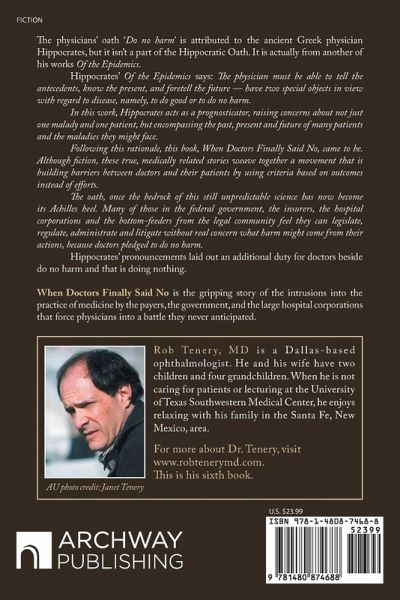 The physicians' oath 'Do no harm' is attributed to the ancient Greek physician Hippocrates, but it isn't a part of the Hippocratic Oath. It is actually from another of his works Of the Epidemics. Hippocrates' Of the Epidemics says: The physician must be able to tell the antecedents, know the present, and foretell the future - have two special objects in view with regard to disease, namely, to do good or to do no harm. In this work, Hippocrates acts as a prognosticator, raising concerns about not just one malady and one patient, but encompassing the past, present and future of many patients and the maladies they might face. Following this rationale, this book, When Doctors Finally Said No, came to be. Although fiction, these true, medically related stories weave together a movement that is building barriers between doctors and their patients by using criteria based on outcomes instead of efforts. The oath, once the bedrock of this still unpredictable science has now become its Achilles heel. Many of those in the federal government, the insurers, the hospital corporations and the bottom-feeders from the legal community feel they can legislate, regulate, administrate and litigate without real concern what harm might come from their actions, because doctors pledged to do no harm. Hippocrates' pronouncements laid out an additional duty for doctors beside do no harm and that is doing nothing. When Doctors Finally Said No is the gripping story of the intrusions into the practice of medicine by the payers, the government, and the large hospital corporations that force physicians into a battle they never anticipated.