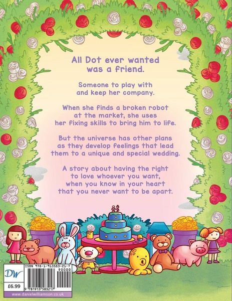 All Dot ever wanted was a friend. Someone to play with and keep her company. When she finds a broken robot at the market she uses her fixing skills to bring him to life. But the universe has other plans as they develop feelings that lead them to a unique and special wedding. A story about having the right to love whoever you want, when you know in your heart that you never want to be apart. After being ignored by her family when she brings her robot to life Dot and Bot become inseparable right up to the point where they decide to spend the rest of their lives together. A wonderful makeshift wedding ensues in this heart-warming story about following your feelings.