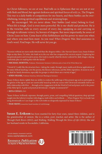 As Christ-followers, we are at war. Paul tells us in Ephesians that we are not at war with flesh and blood, but against darkness and spiritual forces of evil; i.e., The Dragon. This war is a daily battle of competition for our hearts, and these battles can be overwhelming, testing spiritual equilibrium and straining hope. Be encouraged. We are never alone. Your battles (and mine) belong to God. When life is tough, God is even more powerful. He is our shield and protector. He is in the trenches with us every second of every day, equipping us and carrying us through to ultimate victory. So, beware of dragons. But more importantly, be aware of Christ. Lean on him. Come learn of his faithfulness and his power to meet you when and where you need him most. As you read When Dragons War, find assurance in God's word. Find hope. He will never let you go.