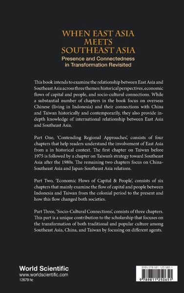 This book intends to examine the relationship between East Asia and Southeast Asia across three themes: historical perspectives, economic flows of capital and people, and socio-cultural connections. While a substantial number of chapters in the book focus on overseas Chinese (living in Indonesia) and their connections with China and Taiwan historically and contemporarily, they also provide in-depth knowledge of international relationship between East Asia and Southeast Asia. Part One, 'Contending Regional Approaches', consists of four chapters that help readers understand the involvement of East Asia from a in historical context. The first chapter on Taiwan before 1975 is followed by a chapter on Taiwan's strategy toward Southeast Asia after the 1980s. The remaining two chapters focus on China-Southeast Asia and Japan-Southeast Asia relations. Part Two, 'Economic Flows of Capital & People', consists of six chapters that mainly examine the flow of capital and people between Indonesia and Taiwan from the colonial period to the present and how this flow changed both societies. Part Three, 'Socio-Cultural Connections', consists of three chapters. This part is a unique contribution to the scholarship that focuses on the transformation of both traditional and popular culture among Southeast Asia, China, and Taiwan by focusing on different agents.