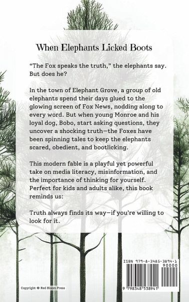 In the quiet town of Elephant Grove, a group of old elephants faithfully watch Fox News, believing every word they hear. But when young Monroe and his loyal dog, Bobo, start questioning the stories they're told, they uncover a shocking truth: the Foxes running the news station have been manipulating the elephants with fear and lies. Join Monroe and Bobo on a brave adventure as they confront the Foxes head-on, showing the elephants the power of independent thought and the danger of blind obedience. This witty and thought-provoking fable explores media literacy, critical thinking, and the importance of questioning the narratives we're fed. Perfect for children and adults alike, When Elephants Licked Boots is a heartwarming reminder that truth always finds its way, even when it's hidden behind the loudest voices.