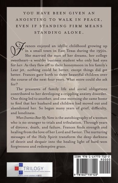 You have been given an anointing to walk in peace, even if standing firm means standing alone. Frances enjoyed an idyllic childhood growing up in a small town in East Texas during the 1950s. She married the man of her dreams, her college sweetheart-a wealthy business student who only had eyes for her. As they flew off to their honeymoon in his family's Lear jet, nothing could be better, except things did get better. Frances gave birth to three beautiful children over the course of the next four years. What more could she ask for? The pressures of family life and social obligations contributed to her developing a crippling anxiety disorder. One thing led to another, and one morning she came home to find that her husband and children had moved out and abandoned her. So began many years of grief, difficulty, and loneliness. When Enemies Bear My Name is the autobiography of a woman who is no stranger to trials and tribulation. Through years of divorce, death, and failure, Frances finds strength and healing from the love of her Lord and Savior. The nurturing messages of the Holy Spirit transform the deep darkness of deceit and despair into the healing light of hard-won forgiveness and redemptive grace.