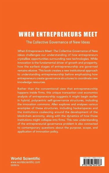 When Entrepreneurs Meet: The Collective Governance of New Ideas challenges our understanding of how entrepreneurs crystallize opportunities surrounding new technologies. While innovation is the fundamental driver of growth and prosperity, how the earliest stages of entrepreneurship are governed remains elusive. This book creates a new, institutional approach to understanding entrepreneurship before emphasizing how entrepreneurs create governance structures to coordinate new knowledge resources. Rather than the conventional view that entrepreneurship happens inside firms, this unique transaction-cost economics analysis of entrepreneurship suggests it might begin earlier in hybrid, polycentric self-governance structures, including the innovation commons. Allen explores and analyses various examples of these structures, including hackerspaces and the institutions coalescing around the development of the blockchain economy, along with the dynamics of how those institutions might collapse into firms. This new understanding of the entrepreneurial governance problem is also connected to contemporary questions about the purpose, scope, and application of innovation policy.