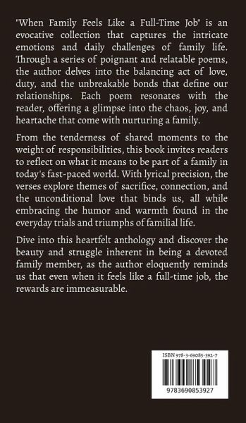 "When Family Feels Like a Full-Time Job" is an evocative collection that captures the intricate emotions and daily challenges of family life. Through a series of poignant and relatable poems, the author delves into the balancing act of love, duty, and the unbreakable bonds that define our relationships. Each poem resonates with the reader, offering a glimpse into the chaos, joy, and heartache that come with nurturing a family. From the tenderness of shared moments to the weight of responsibilities, this book invites readers to reflect on what it means to be part of a family in today's fast-paced world. With lyrical precision, the verses explore themes of sacrifice, connection, and the unconditional love that binds us, all while embracing the humor and warmth found in the everyday trials and triumphs of familial life. Dive into this heartfelt anthology and discover the beauty and struggle inherent in being a devoted family member, as the author eloquently reminds us that even when it feels like a full-time job, the rewards are immeasurable.