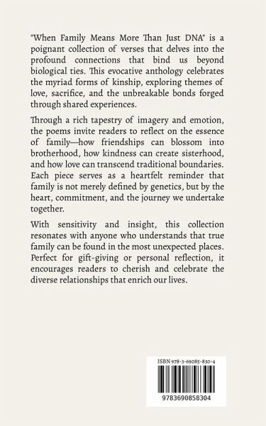 "When Family Means More Than Just DNA" is a poignant collection of verses that delves into the profound connections that bind us beyond biological ties. This evocative anthology celebrates the myriad forms of kinship, exploring themes of love, sacrifice, and the unbreakable bonds forged through shared experiences. Through a rich tapestry of imagery and emotion, the poems invite readers to reflect on the essence of family-how friendships can blossom into brotherhood, how kindness can create sisterhood, and how love can transcend traditional boundaries. Each piece serves as a heartfelt reminder that family is not merely defined by genetics, but by the heart, commitment, and the journey we undertake together. With sensitivity and insight, this collection resonates with anyone who understands that true family can be found in the most unexpected places. Perfect for gift-giving or personal reflection, it encourages readers to cherish and celebrate the diverse relationships that enrich our lives.