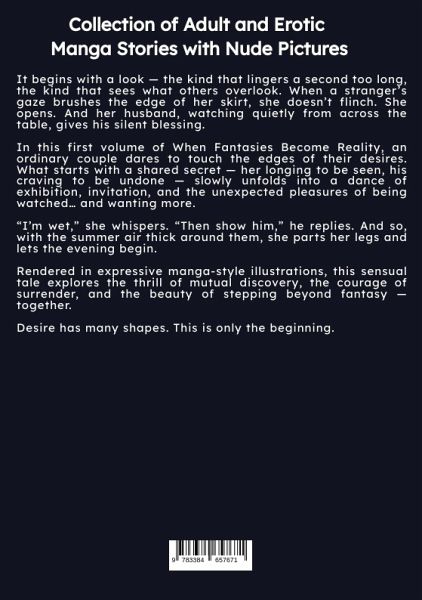 It begins with a look - the kind that lingers a second too long, the kind that sees what others overlook. When a stranger's gaze brushes the edge of her skirt, she doesn't flinch. She opens. And her husband, watching quietly from across the table, gives his silent blessing.In this first volume of When Fantasies Become Reality, an ordinary couple dares to touch the edges of their desires. What starts with a shared secret - her longing to be seen, his craving to be undone - slowly unfolds into a dance of exhibition, invitation, and the unexpected pleasures of being watched... and wanting more."I'm wet," she whispers. "Then show him," he replies. And so, with the summer air thick around them, she parts her legs and lets the evening begin.Rendered in expressive manga-style illustrations, this sensual tale explores the thrill of mutual discovery, the courage of surrender, and the beauty of stepping beyond fantasy - together.Desire has many shapes. This is only the beginning.
