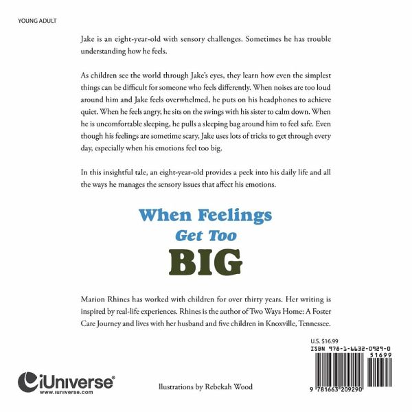 Jake is an eight-year-old with sensory challenges. Sometimes he has trouble understanding how he feels. As children see the world through Jake's eyes, they learn how even the simplest things can be difficult for someone who feels differently. When noises are too loud around him and Jake feels overwhelmed, he puts on his headphones to achieve quiet. When he feels angry, he sits on the swings with his sister to calm down. When he is uncomfortable sleeping, he pulls a sleeping bag around him to feel safe. Even though his feelings are sometime scary, Jake uses lots of tricks to get through every day, especially when his emotions feel too big. In this insightful tale, an eight-year-old provides a peek into his daily life and all the ways he manages the sensory issues that affect his emotions.