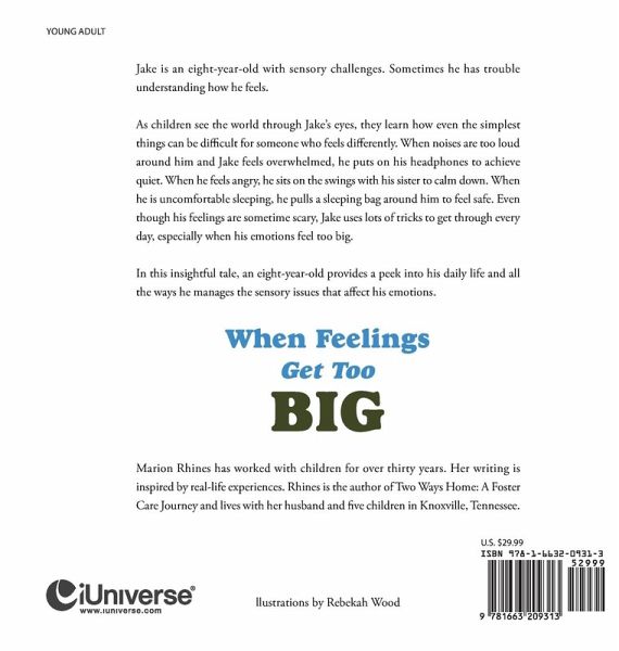 Jake is an eight-year-old with sensory challenges. Sometimes he has trouble understanding how he feels. As children see the world through Jake's eyes, they learn how even the simplest things can be difficult for someone who feels differently. When noises are too loud around him and Jake feels overwhelmed, he puts on his headphones to achieve quiet. When he feels angry, he sits on the swings with his sister to calm down. When he is uncomfortable sleeping, he pulls a sleeping bag around him to feel safe. Even though his feelings are sometime scary, Jake uses lots of tricks to get through every day, especially when his emotions feel too big. In this insightful tale, an eight-year-old provides a peek into his daily life and all the ways he manages the sensory issues that affect his emotions.