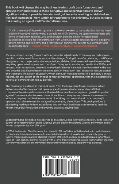 This book will change the way business leaders craft transformations and execute their businesses in these disruptive and uncertain times to deliver significant value. It provides foundational guidance for rewiring established and non-tech companies from within to transform to not only grow but also mitigate risks during an age of multifaceted disruptions. "It is in the midst of these disruptions that we can awaken to the realization that we need a boldly innovative way forward, a paradigm shift in the way we operate to navigate and thrive in these new realities...this book couldn't be more timely for established businesses as it calls for transformation from within, a capital light operational discipline before moving capital heavy and a real focus on our internal powers as a company and business leaders." - Marwan Fawaz, Executive Advisor, Google and Alphabet It's easy to keep moving forward with incremental adjustments to the way we do business despite the clear need for more substantive change. During times of accelerating multifaceted disruptions, both projected and unexpected, established businesses will need to rewire the way they operate to innovate and transform if they are to survive and lead in the 2020s and beyond. Most established business innovation initiatives have not truly innovated in the last two decades and have relied on the same tools of innovation labs, corporate venture capital and traditional innovation education, which although front and center in a company's annual reports, can still be left at the fringes of most companies' operations, with the exception of a handful of dominant technology players. The foundations outlined in this book come from the Movement Maker program, which delivers a set of techniques that operators and business leaders apply to craft their companies' transformations from within to deliver new lines of repeated growth to protect against foreseen and unforeseen disruptions. It also catalyzes and develops movements within a company that lead to new ways of working that are authentic to a company's operators but also relevant for an age of accelerating disruptions. This book provides a pioneering roadmap for how established and non-tech businesses can rewire to lead the Fourth Industrial Revolution and level the business playing field. Sodan Ray Selva developed his expertise as an executive and innovator alongside C-suite leaders in pursuit of transformation at public (Disney), private equity (Blackstone Capital) and venture capital funded companies for over 25+ years. In 2014, he founded Chia Ventures, Inc., based in Silicon Valley, with the mission to crack the code on how established companies could successfully transform, innovate and repeatedly grow in today's marketplace, realizing classical wisdom of the 20th century could not keep up. After three years of R&D, testing, piloting, iterating with C-level transformationalists and learning from Stanford University researchers, the Movement Maker (movementmaker.io) program was launched.