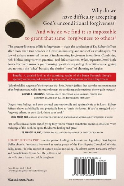 Why do we have difficulty accepting God's unconditional forgiveness? And why do we find it so impossible to grant that same forgiveness to others? The bottom-line issue of life is forgiveness—that's the conclusion of Dr. Robert Jeffress after more than two decades in Christian ministry, and most of us would agree. Yet few of us have mastered the art of implementing forgiveness in our lives. Combining rich, biblical insights with practical, real-life situations, When Forgiveness Doesn't Make Sense effectively answers your burning questions regarding this critical issue, giving you not only the "why's,” but also the elusive "how's” of choosing to forgive. **Inside: A detailed look at the surprising results of the Barna Research Group's specially commissioned national opinion study of Americans' views on forgiveness.
