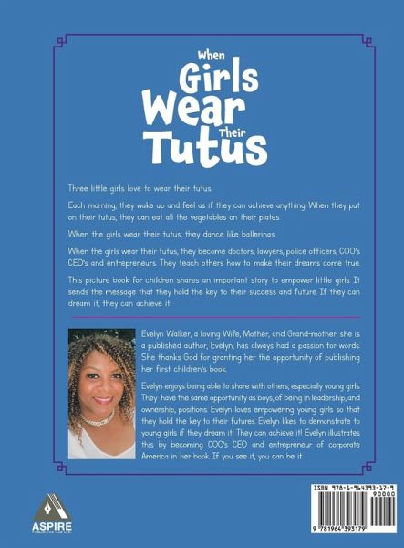 Three little girls love to wear their tutus. Each morning, they wake up and feel as if they can achieve anything. When they put on their tutus, they can eat all the vegetables on their plates. When the girls wear their tutus, they dance like ballerinas. When the girls wear their tutus, they become doctors, lawyers, police officers, COO's CEO's and entrepreneurs. They teach others how to make their dreams come true. This picture book for children shares an important story to empower little girls. It sends the message that they hold the key to their success and future. If they can dream it, they can achieve it. Evelyn Walker, a loving Wife, Mother, and Grand-mother, she is a published author, Evelyn, has always had a passion for words. She thanks God for granting her the opportunity of publishing her first children's book. Evelyn enjoys being able to share with others, especially young girls. They have the same opportunity as boys, of being in leadership, and ownership, positions. Evelyn loves empowering young girls so that they hold the key to their futures. Evelyn likes to demonstrate to young girls if they dream it! They can achieve it! Evelyn illustrates this by becoming COO's CEO and entrepreneur of corporate America in her book. If you see it, you can be it.