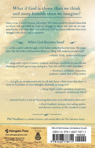 Deep inside each one of us is a deep empty space. We work and strive with great energy toward ideals and objectives that, in the quiet of the night, when we are alone with our thoughts, we know will never fill that space. This human chafing point is universal and although we become quite accomplished at hiding it, it never leaves us. It is always there, under the surface, this struggle to figure out who we are supposed to be as humans, with each other and with God. It is this most basic human struggle that author Phil Needham addresses in When God Becomes Small. This beautiful, profound book looks with clarity and compassion at our human misconceptions of God and of ourselves. We seem naturally obsessed with more, bigger, and we despise what is small, or less. We make God out to be something God is not, we misunderstand the greatness of God, and see God as gigantic, distant, remote. At the same time, we make ourselves out to be smaller than we are, and our lives less significant than they are. We let ourselves off the hook, so that we can downgrade our self-expectations. But Phil Needham does not leave us there. As the book unfolds we see how God saves us from these misconceptions. And we learn how we might follow God to the freedom of becoming small.