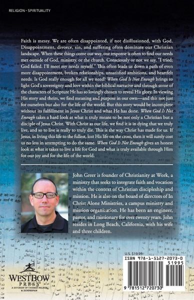 Faith is messy. We are often disappointed, if not disillusioned, with God. Disappointment, divorce, sin, and suffering often dominate our Christian landscape. When these things come our way, our response is often to find our needs met outside of God, ministry, or the church. Consciously or not we say, "I tried; God failed. I'll meet my needs myself." This often leads us down a path of even more disappointment, broken relationships, unsatisfied ambitions, and heartfelt needs. Is God really enough for all we need? When God Is Not Enough brings to light God's sovereignty and love within the biblical narrative and through some of the characters of Scripture He has so lovingly chosen to reveal His glory. In viewing His story and theirs, we find meaning and purpose in our own-and this not just for ourselves but also for the life of the world. But this story would be incomplete without its fulfillment in Jesus Christ and what He has done. When God Is Not Enough takes a hard look at what it truly means to be not only a Christian but a disciple of Jesus Christ. With Christ as our life, we find it is in dying that we truly live, and so to live is really to truly die. This is the way Christ has made for us. If Jesus, in living this life to the fullest, lost His life on the cross, then it will surely cost us no less in attempting to do the same. When God Is Not Enough gives an honest look at what it takes to live a life for God and what is truly available through Him for our joy and for the life of the world.