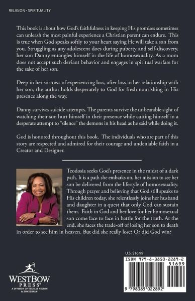 This book is about how God's faithfulness in keeping His promises sometimes can unleash the most painful experience a Christian parent can endure. This is true when God speaks softly to your heart saying He will take a son from you. Struggling as any adolescent does during puberty and self-discovery, her son Danny entangles himself in the life of homosexuality. As a mom does not accept such deviant behavior and engages in spiritual warfare for the sake of her son. Deep in her sorrows of experiencing loss, after loss in her relationship with her son, the author holds desperately to God for fresh nourishing in His presence along the way. Danny survives suicide attempts. The parents survive the unbearable sight of watching their son hurt himself in their presence while cutting himself in a desperate attempt to "silence" the demons in his head as he said while doing it. God is honored throughout this book. The individuals who are part of this story are respected and admired for their courage and undeniable faith in a Creator and Designer.