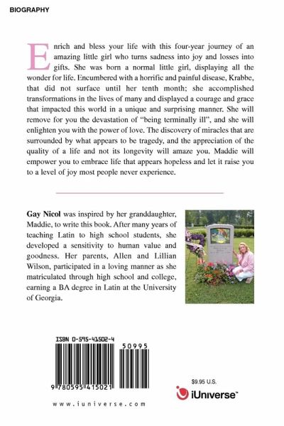 Enrich and bless your life with this four-year journey of an amazing little girl who turns sadness into joy and losses into gifts. She was born a normal little girl, displaying all the wonder for life. Encumbered with a horrific and painful disease, Krabbe, that did not surface until her tenth month; she accomplished transformations in the lives of many and displayed a courage and grace that impacted this world in a unique and surprising manner. She will remove for you the devastation of "being terminally ill", and she will enlighten you with the power of love. The discovery of miracles that are surrounded by what appears to be tragedy, and the appreciation of the quality of a life and not its longevity will amaze you. Maddie will empower you to embrace life that appears hopeless and let it raise you to a level of joy most people never experience.