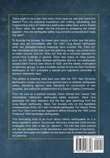 There ought to be a law! How many times have we said and heard this desire? From his extensive experience with crafting, advocating, and implementing many of California's earthquake safety laws, author Robert A. Olson takes the reader into the process by answering the critical question: How are earthquake safety requirements conceived and made into laws? To illustrate the process, he draws upon history to show how the policy stage was set immediately after the 1933 Long Beach earthquake when two precedent-setting measures were enacted: the "Field Act" that centralized at the state level the planning, design, and construction of public schools, and the "Riley Act" that set a minimum standard for constructing buildings in general. Olson also draws on other events, such as the 1925 Santa Barbara earthquake and the non-earthquake caused Saint Francis Dam failure of 1928, and the steady mobilization of advocacy groups, to add a broader context of how the San Fernando earthquake of 1971 prompted a special joint legislative committee to sponsor noteworthy laws. The politics of enacting state laws soon after the 1971 San Fernando earthquake include requiring local general plans to address earthquake safety, stipulating rigorous state standards for construction of new hospitals, and calling for establishment of a Seismic Safety Commission. From his view as a political scientist, Olson defines four "waves" that characterize California's earthquake safety evolution. Wave One addresses the early disasters and the two laws stemming from the Long Beach earthquake. Wave Two focuses only on the legislative consequences of the 1971 San Fernando earthquake. For Waves Three and Four Olson summarizes legislative efforts following the 1989 Loma Prieta and 1994 Northridge earthquakes. This fascinating book is as much about historic earthquakes as it is about legislative politics: the process that every proposed California law undergoes from idea to law (or rejection). The bills that were passed into law are testaments to the earnestness and diligence of lawmakers, volunteer advocates and staffers whose desire was to protect the people of California.