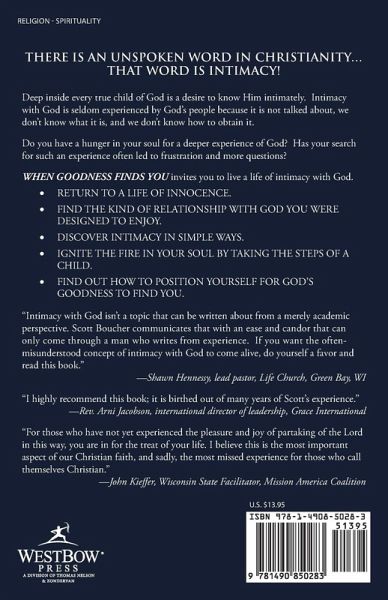 THERE IS AN UNSPOKEN WORD IN CHRISTIANITY… THAT WORD IS INTIMACY! Deep inside every true child of God is a desire to know Him intimately. Intimacy with God is seldom experienced by God's people because it is not talked about, we don't know what it is, and we don't know how to obtain it. Do you have a hunger in your soul for a deeper experience of God? Has your search for such an experience often led to frustration and more questions? WHEN GOODNESS FINDS YOU invites you to live a life of intimacy with God. RETURN TO A LIFE OF INNOCENCE. FIND THE KIND OF RELATIONSHIP WITH GOD YOU WERE DESIGNED TO ENJOY. DISCOVER INTIMACY IN SIMPLE WAYS. IGNITE THE FIRE IN YOUR SOUL BY TAKING THE STEPS OF A CHILD. FIND OUT HOW TO POSITION YOURSELF FOR GOD'S GOODNESS TO FIND YOU. "Intimacy with God isn't a topic that can be written about from a merely academic perspective. Scott Boucher communicates that with an ease and candor that can only come through a man who writes from experience. If you want the often-misunderstood concept of intimacy with God to come alive, do yourself a favor and read this book." -Shawn Hennessy, lead pastor, Life Church, Green Bay, WI "I highly recommend this book; it is birthed out of many years of Scott's experience." -Rev. Arni Jacobson, international director of leadership, Grace International "For those who have not yet experienced the pleasure and joy of partaking of the Lord in this way, you are in for the treat of your life. I believe this is the most important aspect of our Christian faith, and sadly, the most missed experience for those who call themselves Christian." -John Kieffer, Wisconsin State Facilitator, Mission America Coalition