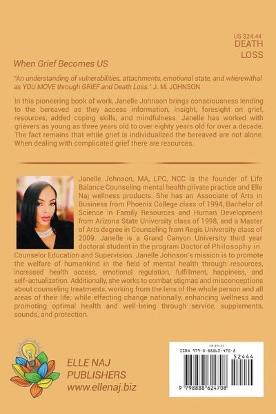 DEATH LOSS In this pioneering book of work, Janelle Johnson brings consciousness lending to the bereaved as they access information, insight, foresight on grief, resources, added coping skills, and mindfulness. Janelle has worked with grievers as young as three years old to late adulthood for over a decade. The fact remains that while grief is individualized, the bereaved are not alone. When dealing with complicated grief, there are resources. Through the grief process with health access, acceptance, and movement, there is growth toward healing. This book shows death loss's impact on the bereaved person's vulnerabilities, attachments, emotional state, and wherewithal as they move through grief and death loss.