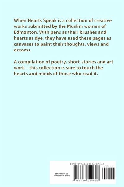 When Hearts Speak is a collection of creative works submitted by several Muslim women in Edmonton, Alberta, Canada. With pens as their brushes and hearts as dye, they have used these pages as canvases to paint their thoughts, views, and dreams. A compilation of poetry, short-stories, and artwork - this collection is sure to touch the hearts and minds of those who read it.