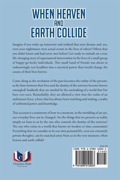 Imagine if you woke up tomorrow and realized that your dreams and, yes, even your nightmares were actual events in the lives of others! Others that you didn't know and had never met before! Get ready to embark on a true life-changing story of supernatural intervention in the lives of a small group of happy-go-lucky individuals. This small band of friends was about to unknowingly run headfirst into a mystical power that would change the course of their lives forever. Come along as the revelation of the past becomes the reality of the present, as the lines between their lives and the destiny of the universe become forever entangled! Suddenly they are startled by the uncloaking of a world that few have ever seen. Remarkably, they are allowed a view into the realm of an unforeseen force, a force that has always been watching and waiting, a realm of unlimited power and knowledge. This account is a testimony of how in a moment, in the twinkling of an eye, our everyday lives can be changed. Are the things that we perceive as reality simply on loan to us by the one who controls the destiny of the universe? The one who exists in a world that knows no borders or time constraints? Everything that we consider to be our own personal life, even our extremely private thoughts, can be snatched away from us in the very moment, when heaven and earth collide!