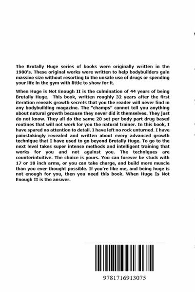 When Huge is Not Enough II is the culmination of 44 years of being Brutally Huge. This book, written roughly 32 years after the first iteration reveals growth secrets that you the reader will never find in any bodybuilding magazine. The "champs" cannot tell you anything about natural growth because they never did it themselves. They just don't know. They all do the same 20 set per body part drug based routines that will not work for you the natural trainer. In this book, I have spared no attention to detail. I have left no rock unturned. I have painstakingly revealed and written about every advanced growth technique that I have used to go beyond Brutally Huge. To go to the next level takes super intense methods and intelligent training that works for you and not against you. The techniques are counterintuitive. The choice is yours. You can forever be stuck with 17 or 18 inch arms, or you can take charge, and build more muscle than you ever thought possible. If you're like me, and being huge is not enough for you, then you need this book. When Huge Is Not Enough II is the answer.