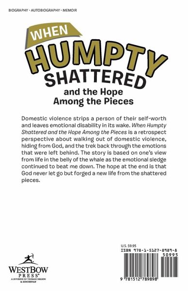 Domestic violence strips a person of their self-worth and leaves emotional disability in its wake. When Humpty Shattered and the Hope Among the Pieces is a retrospect perspective about walking out of domestic violence, hiding from God, and the trek back through the emotions that were left behind. The story is based on one?s view from life in the belly of the whale as the emotional sledge continued to beat me down. The hope at the end is that God never let go but forged a new life from the shattered pieces.