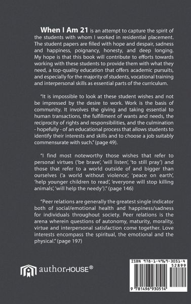 When I Am 21 is an attempt to capture the spirit of the students with whom I worked in residential placement. The student papers are filled with hope and despair, sadness and happiness, poignancy, honesty, and deep longing. My hope is that this book will contribute to efforts towards working with these students to provide them with what they need, a top-quality education that offers academic pursuits, and especially for the majority of students, vocational training and interpersonal skills as essential parts of the curriculum. "It is impossible to look at these student wishes and not be impressed by the desire to work. Work is the basis of community. It involves the giving and taking essential to human transactions, the fulfillment of wants and needs, the reciprocity of rights and responsibilities, and the culmination - hopefully - of an educational process that allows students to identify their interests and skills and to choose a job suitably commensurate with such." (page 49). "I find most noteworthy those wishes that refer to personal virtues ('be brave', 'will listen', 'to still pray') and those that refer to a world outside of and bigger than ourselves ('a world without violence', 'peace on earth', 'help younger children to read', 'everyone will stop killing animals', 'will help the needy')." (page 146) "Peer relations are generally the greatest single indicator both of social/emotional health and happiness/sadness for individuals throughout society. Peer relations is the arena wherein questions of autonomy, maturity, morality, virtue and interpersonal satisfaction come together. Love interests encompass the spiritual, the emotional and the physical." (page 197)