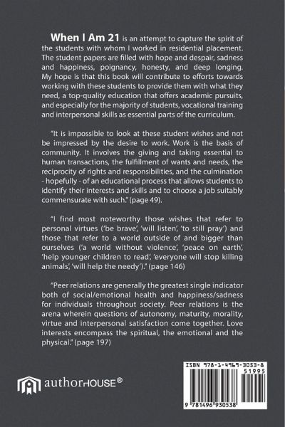 When I Am 21 is an attempt to capture the spirit of the students with whom I worked in residential placement. The student papers are filled with hope and despair, sadness and happiness, poignancy, honesty, and deep longing. My hope is that this book will contribute to efforts towards working with these students to provide them with what they need, a top-quality education that offers academic pursuits, and especially for the majority of students, vocational training and interpersonal skills as essential parts of the curriculum. "It is impossible to look at these student wishes and not be impressed by the desire to work. Work is the basis of community. It involves the giving and taking essential to human transactions, the fulfillment of wants and needs, the reciprocity of rights and responsibilities, and the culmination - hopefully - of an educational process that allows students to identify their interests and skills and to choose a job suitably commensurate with such." (page 49). "I find most noteworthy those wishes that refer to personal virtues ('be brave', 'will listen', 'to still pray') and those that refer to a world outside of and bigger than ourselves ('a world without violence', 'peace on earth', 'help younger children to read', 'everyone will stop killing animals', 'will help the needy')." (page 146) "Peer relations are generally the greatest single indicator both of social/emotional health and happiness/sadness for individuals throughout society. Peer relations is the arena wherein questions of autonomy, maturity, morality, virtue and interpersonal satisfaction come together. Love interests encompass the spiritual, the emotional and the physical." (page 197)