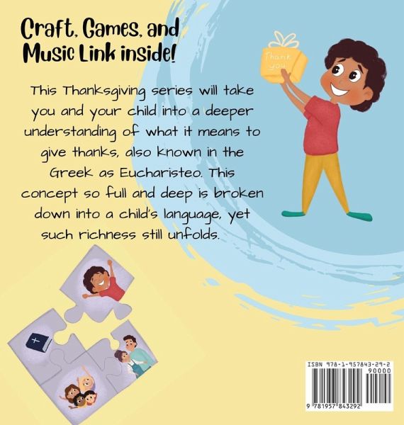 When I am Thankful is an overview of the whole series, perfect to begin your journey into a more profound thanksgiving. The When I Am Thankful Thanksgiving series helps you and your children dive deep into the meaning of thanksgiving. From slowing down and noticing the many things we have to be thankful for and counting and naming them to notice how many blessings we truly have! As we give thanks more, our joy grows, and we enjoy life better. We see God's grace and know it is a gift. Thanksgiving draws us into a deeper relationship with God and others in our life. As we pause and give thanks, it changes who we are. Eucharisteo thanks is a lifestyle that we choose, and these books will help you along the way. Each book contains a craft to help you record your thanks, as well as games and a QR code to Yancy's Thanksgiving Playlist. Use these as books to read or as a complete Children's Worship (or Sunday School) experience! Perfect for ages 3-10, but older kids and adults have fallen in love with them as well!