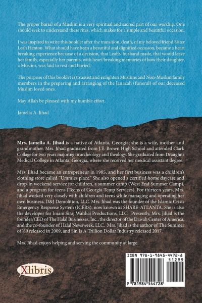 The proper burial of a Muslim is a very spiritual and sacred part of our worship. One should seek to understand these rites, which makes for a simple and beautiful occasion. I was inspired to write this booklet after the transition, death, of my beloved friend Sister Leah Henton. What should have been a beautiful and dignified occasion, became a heart breaking experience because of a decision, that Leahs husband made, that would leave her family, especially her parents, with heart breaking memories of how their daughter, a Muslim, was laid to rest and buried. The purpose of this booklet is to assist and enlighten Muslims and Non-Muslim family members in the preparing and arranging of the Janazah (funeral) of our deceased Muslim loved ones. May Allah be pleased with my humble effort. Jamella Jihad
