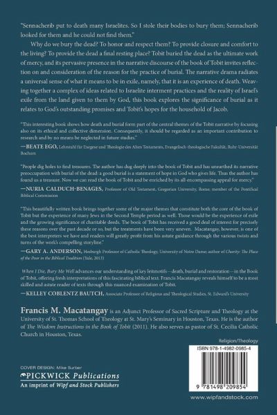 ""Sennacherib put to death many Israelites. So I stole their bodies to bury them; Sennacherib looked for them and he could not find them."" Why do we bury the dead? To honor and respect them? To provide closure and comfort to the living? To provide the dead a final resting place? Tobit buried the dead as the ultimate work of mercy, and its pervasive presence in the narrative discourse of the book of Tobit invites reflection on and consideration of the reason for the practice of burial. The narrative drama radiates a universal sense of what it means to be in exile, namely, that it is an experience of death. Weaving together a complex of ideas related to Israelite interment practices and the reality of Israel's exile from the land given to them by God, this book explores the significance of burial as it relates to God's outstanding promises and Tobit's hopes for the household of Jacob.