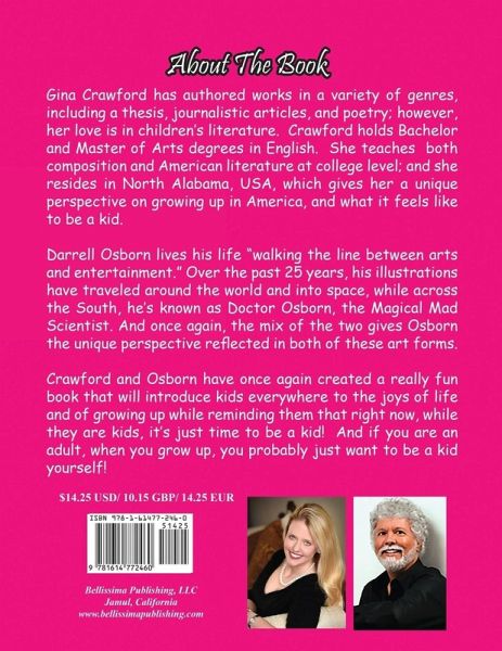 Gina Crawford has authored works in a variety of genres, including a thesis, journalistic articles, and poetry; however, her love is in children's literature. Crawford holds Bachelor and Master of Arts degrees in English. She teaches both composition and American literature at college level; and she resides in North Alabama, USA, which gives her a unique perspective on growing up in America, and what it feels like to be a kid. Darrell Osborn lives his life "walking the line between arts and entertainment." Over the past 25 years, his illustrations have traveled around the world and into space, while across the South, he's known as Doctor Osborn, the Magical Mad Scientist. And once again, the mix of the two gives Osborn the unique perspective reflected in both of these art forms. Crawford and Osborn have once again created a really fun book that will introduce kids everywhere to the joys of life and of growing up while reminding them that right now, while they are kids, it's just time to be a kid! And if you are an adult, when you grow up, you probably just want to be a kid yourself!