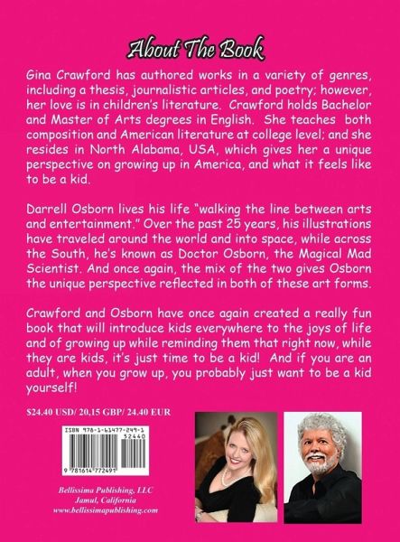 Gina Crawford has authored works in a variety of genres, including a thesis, journalistic articles, and poetry; however, her love is in children's literature. Crawford holds Bachelor and Master of Arts degrees in English. She teaches both composition and American literature at college level; and she resides in North Alabama, USA, which gives her a unique perspective on growing up in America, and what it feels like to be a kid. Darrell Osborn lives his life "walking the line between arts and entertainment." Over the past 25 years, his illustrations have traveled around the world and into space, while across the South, he's known as Doctor Osborn, the Magical Mad Scientist. And once again, the mix of the two gives Osborn the unique perspective reflected in both of these art forms. Crawford and Osborn have once again created a really fun book that will introduce kids everywhere to the joys of life and of growing up while reminding them that right now, while they are kids, it's just time to be a kid! And if you are an adult, when you grow up, you probably just want to be a kid yourself!