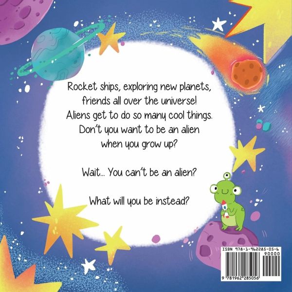 The perfect book for young astronauts in training! Rocket ships, exploring new planets, friends all over the universe! Aliens get to do so many cool things. Don't you want to be an alien when you grow up? Wait...You can't be an alien? What will you be instead? A young girl wants to be an alien when she grows up. Unfortunately, she is told she can't be an alien. Faced with this news, she has to change her goals and instead decides she will be an astronomer or an astronaut. Encourage your young outer space aficionado to embrace their love of the cosmos and inspire them to consider a career in astronomy. Although they can't be an alien when they grow up, they can follow along with this fun and educational book to learn about what astronomers and astronauts do. Perfect for:Space aficionados Future astronauts Preschool to second grade kids Parents, grandparents, and teachers of young children Fans of popular children's books like Pete the Cat: Out of This World, Jupiter the Gassy Giant, and There's No Place Like Space! All About Our Solar System