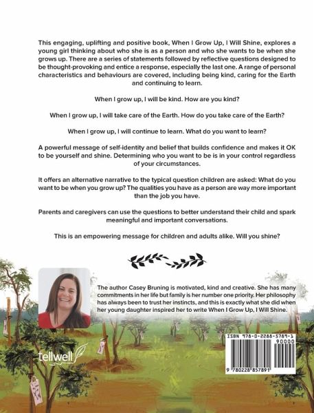 This engaging, uplifting and positive book, When I Grow Up, I Will Shine, explores a young girl thinking about who she is as a person and who she wants to be when she grows up. There are a series of statements followed by reflective questions designed to be thought-provoking and entice a response, especially the last one. A range of personal characteristics and behaviours are covered, including being kind, caring for the Earth and continuing to learn. When I grow up, I will be kind. How are you kind? When I grow up, I will take care of the Earth. How do you take care of the Earth? When I grow up, I will continue to learn. What do you want to learn? A powerful message of self-identity and belief that builds confidence and makes it OK to be yourself and shine. Determining who you want to be is in your control regardless of your circumstances. It offers an alternative narrative to the typical question children are asked: What do you want to be when you grow up? The qualities you have as a person are way more important than the job you have. Parents and caregivers can use the questions to better understand their child and spark meaningful and important conversations. This is an empowering message for children and adults alike. Will you shine?