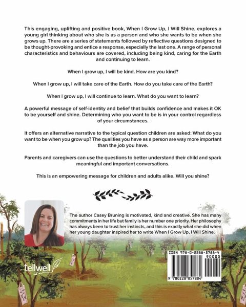 This engaging, uplifting and positive book, When I Grow Up, I Will Shine, explores a young girl thinking about who she is as a person and who she wants to be when she grows up. There are a series of statements followed by reflective questions designed to be thought-provoking and entice a response, especially the last one. A range of personal characteristics and behaviours are covered, including being kind, caring for the Earth and continuing to learn. When I grow up, I will be kind. How are you kind? When I grow up, I will take care of the Earth. How do you take care of the Earth? When I grow up, I will continue to learn. What do you want to learn? A powerful message of self-identity and belief that builds confidence and makes it OK to be yourself and shine. Determining who you want to be is in your control regardless of your circumstances. It offers an alternative narrative to the typical question children are asked: What do you want to be when you grow up? The qualities you have as a person are way more important than the job you have. Parents and caregivers can use the questions to better understand their child and spark meaningful and important conversations. This is an empowering message for children and adults alike. Will you shine?