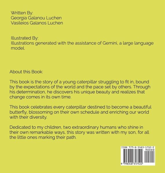 About this Book: This book is the story of a young caterpillar struggling to fit in, bound by the expectations of the world and the pace set by others. Through his determination, he discovers his unique beauty and realizes that change comes in its own time. This book celebrates every caterpillar destined to become a beautiful butterfly, blossoming on their own schedule and enriching our world with their diversity. Dedicated to my children, two extraordinary humans who shine in their own remarkable ways, this story was written with my son, for all the little ones marking their path.