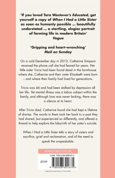 'If you loved Tara Westover's Educated, get yourself a copy of When I Had a Little Sisteras soon as humanly possible...beautifully under-stated...a startling, elegiac portrait of farming life in modern Britain.' Vogue 'Gripping and heart-wrenching' Mail on Sunday On a cold December day in 2013 Catherine Simpson received the phone call she had feared for years. Her little sister Tricia had been found dead in the farmhouse where she, Catherine and their sister Elizabeth were born - and where their family had lived for generations. Tricia was 46 and had been stalked by depression all her life. Yet mental illness was a taboo subject within the family and although love was never lacking, there was a silence at its heart. After Tricia died, Catherine found she had kept a lifetime of diaries. The words in them took her back to a past they had shared, but experienced so differently, and offered a thread to help explore the labyrinth of her sister's suicide. When I had a Little Sister tells a story of sisters and sacrifice, grief and reclamation, and of the need to speak the unspeakable.